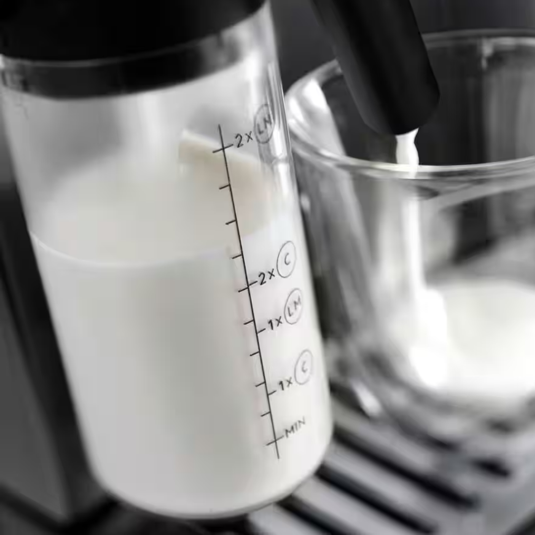 Pour the amount of milk you want into the carafe and press the MyLatte button on the control panel. The machine detects the exact amount of milk and uses all of it, so no milk needs to be stored in the refrigerator.